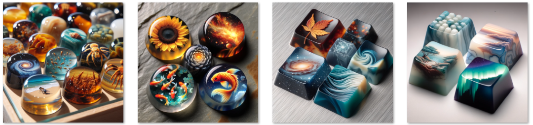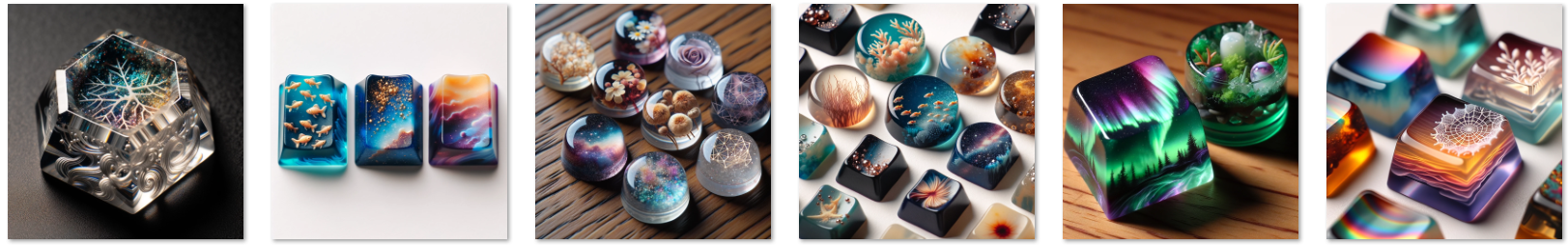 - 독창성: 일반적인 키캡과는 다르게, 레진 아트 키캡은 각각의 디자인이 독특하고 아름답습니다. 정말 키캡 하나하나가 다르며 대부분 만드시는 분들이 정말 꼼꼼하고 예쁘게 만드려고 노력해주신 작품이기 때문에 쓰는 입장에서는 만족도가 정말 높습니다.