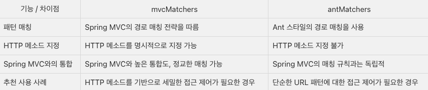 | 기능 / 차이점 | mvcMatchers | antMatchers |