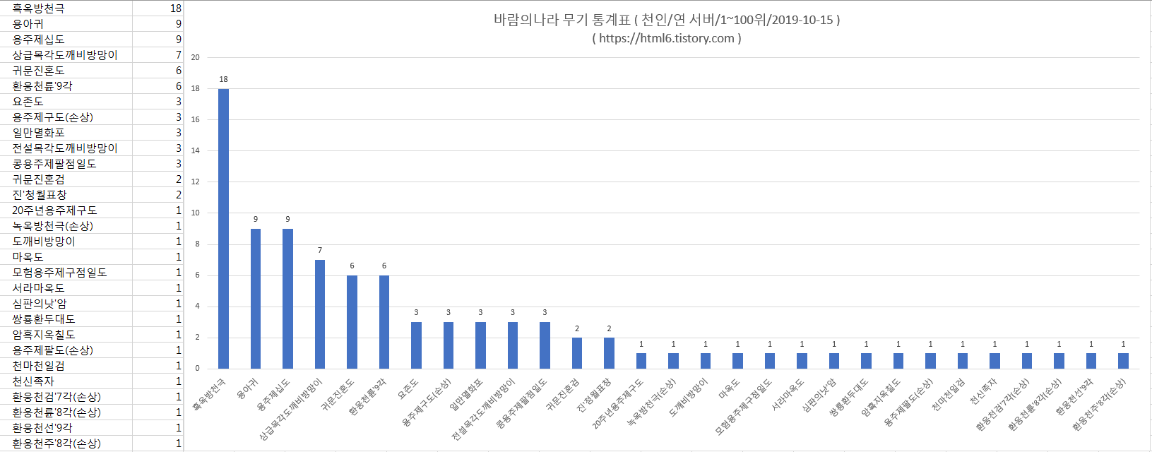 [ 바람의나라 무기 통계표 ( 천인/연 서버/1~100위/2019-10-15 ) ]