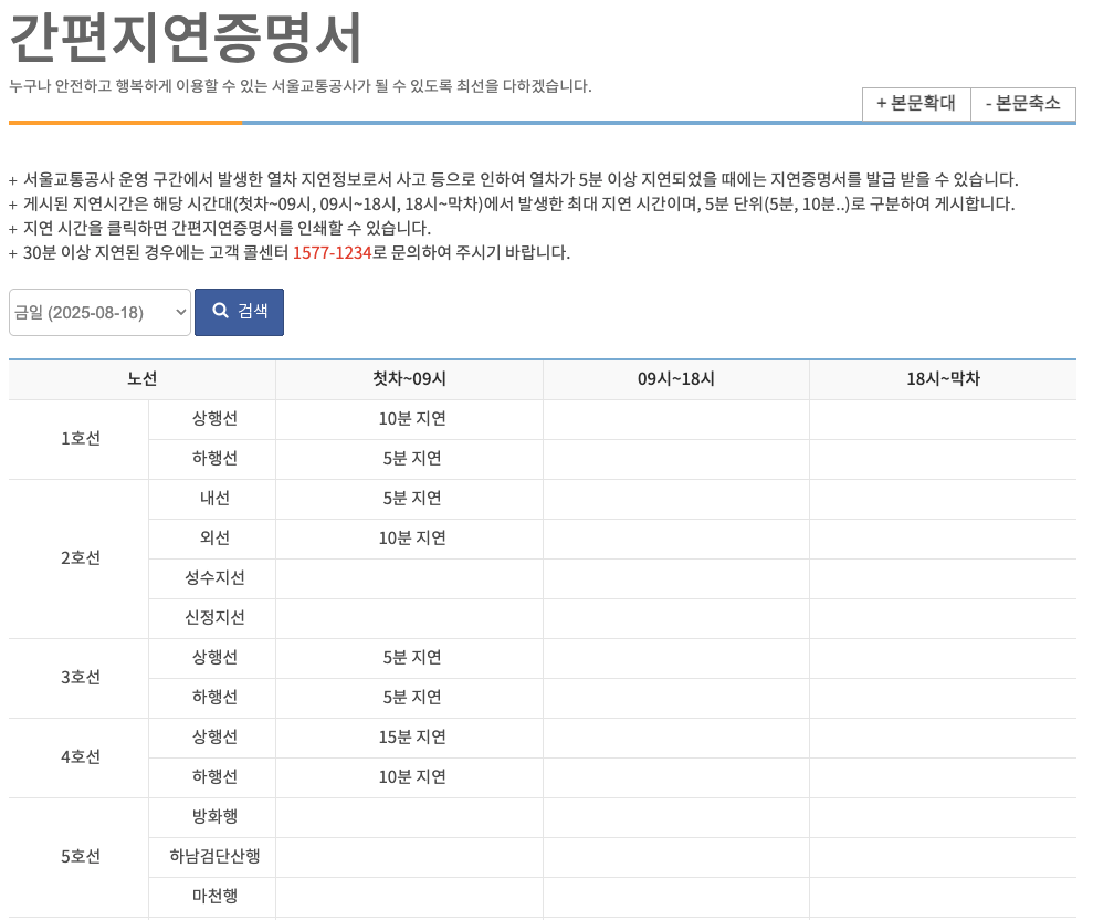 - 서울교통공사 구간(주로 2·5·6·7·8호선 전구간, 1·3·4호선 일부 구간): 위 절차대로 간편 지연증명서를 발급합니다.