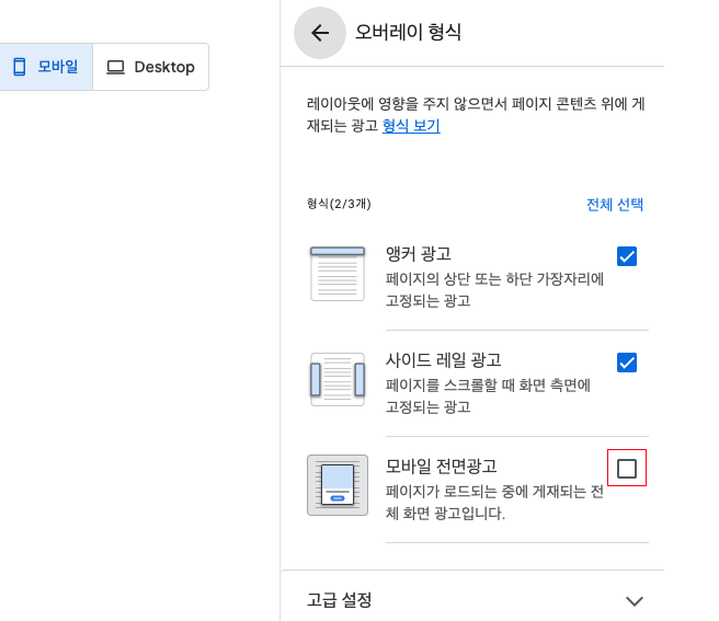 - 자동광고의 다른 **오버레이 형식(앵커 광고)**은 별도 옵션이며, 이 글의 제한 대상은 전면(Vignette) 포맷입니다. 기능 차이는 구글 도움말 정의를 참고하세요.