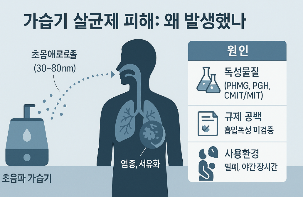 국내 최악의 생활화학 참사로 기록된 가습기 살균제 사건은 단일 원인으로 설명되지 않는다. 독성 물질 자체의 문제, 초음파 가습기라는 기기 특성, 규제 공백과 기업의 안전성 검증 실패, 사용 환경과 취약집단 노출까지 여러 층위가 포개져 대규모 피해로 이어졌다.
