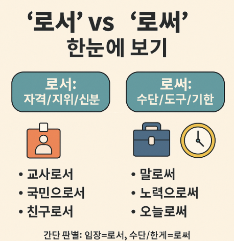 - 로서: 자격·지위·신분. 즉, 어떤 입장이나 정체성을 말할 때. 예) 교사로서, 친구로서, 국민으로서.
