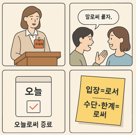 - 말로써 vs 말로서: 말이라는 수단으로 해결한다면 ‘말로써’가 자연스럽습니다.