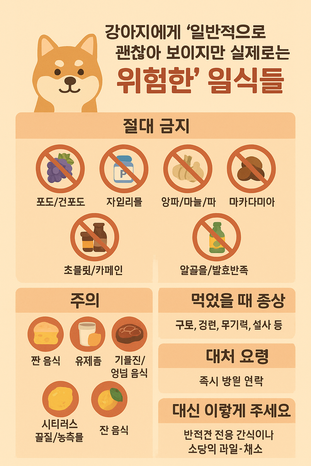 - 절대 금지: 포도/건포도, 자일리톨, 초콜릿/카페인, 알코올/발효반죽, 마카다미아, 양파/마늘.