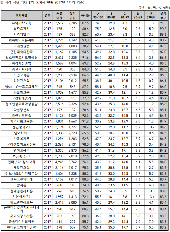 보시면 평균 83점 ( B ) 이상이며 90점 ( A ) 이상인 과목들도 있습니다.