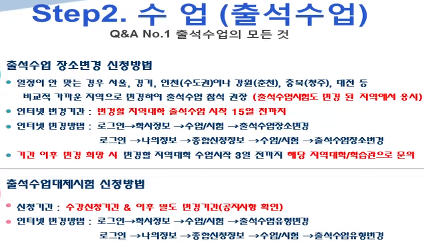 또한 기존 신청해둔 캠퍼스와 다른곳에서 출석수업, 기말고사 응시 등도 미리 변경 신청하면 가능합니다.