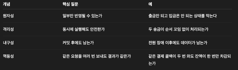 | 원자성 | 일부만 반영될 수 있는가 | 출금만 되고 입금은 안 되는 상태를 막는다 |