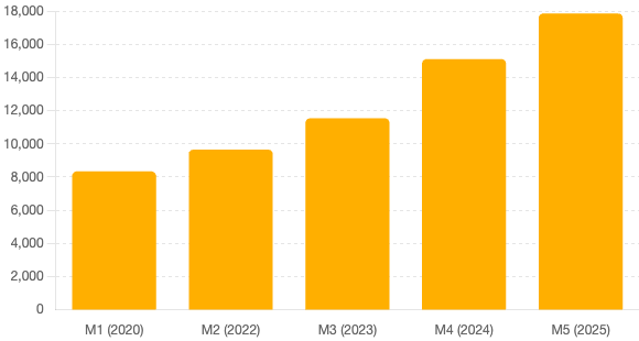 M1부터 M5까지 5년간의 성능 곡선은 “완만-완만-쑥-쑥” 구조입니다. 그래서 M1·M2 중고는 아직도 살 가치가 있는 반면, M3 이상은 중고 가격이 높아서 새로 나온 M5와 간격이 좁아졌습니다. 이럴 때는 성능이 더 뛰고 출시일이 가장 최신인 제품을 고르는 게 보통은 더 이득입니다. 앞으로 2~3년은 macOS 업데이트도 M5만을 위한 기능이 꾸준히 붙을 가능성이 크니까요.