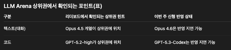 | 텍스트(대화) | Opus 4.5 계열이 상위권에 위치 | Opus 4.6은 반영 지연 가능 |
