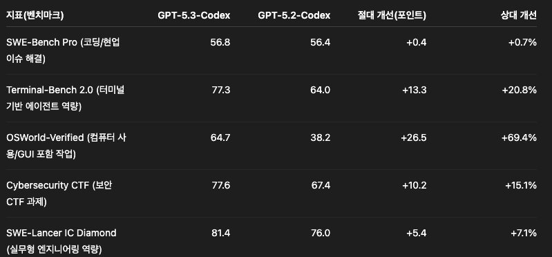 아래 표는 공개된 공식 벤치마크 수치 기준으로 GPT-5.3-Codex가 GPT-5.2-Codex 대비 어느 정도 올랐는지 정리한 것입니다. (점수는 높을수록 좋고, 괄호의 “상대 개선”은 단순 비율 비교로 참고용입니다.)