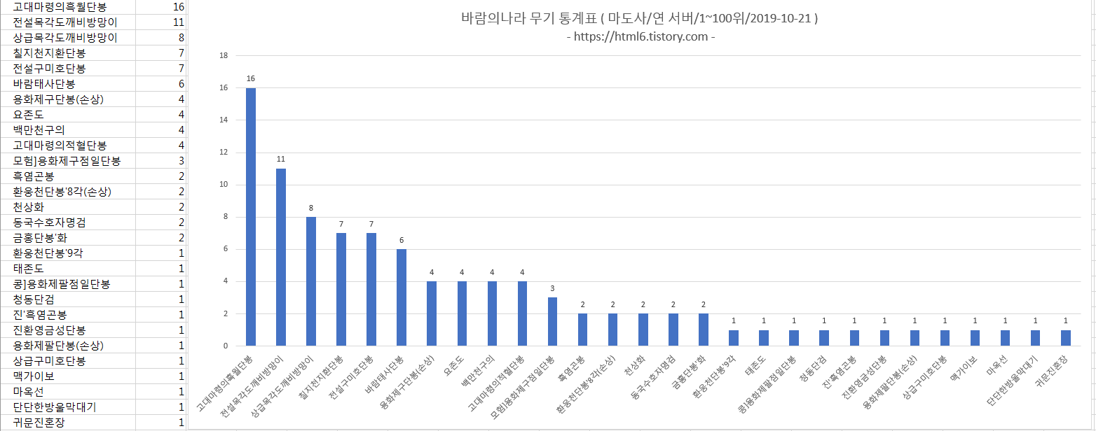 [ 바람의나라 무기 통계표 ( 마도사/연 서버/1~100위/2019-10-21 ) ]