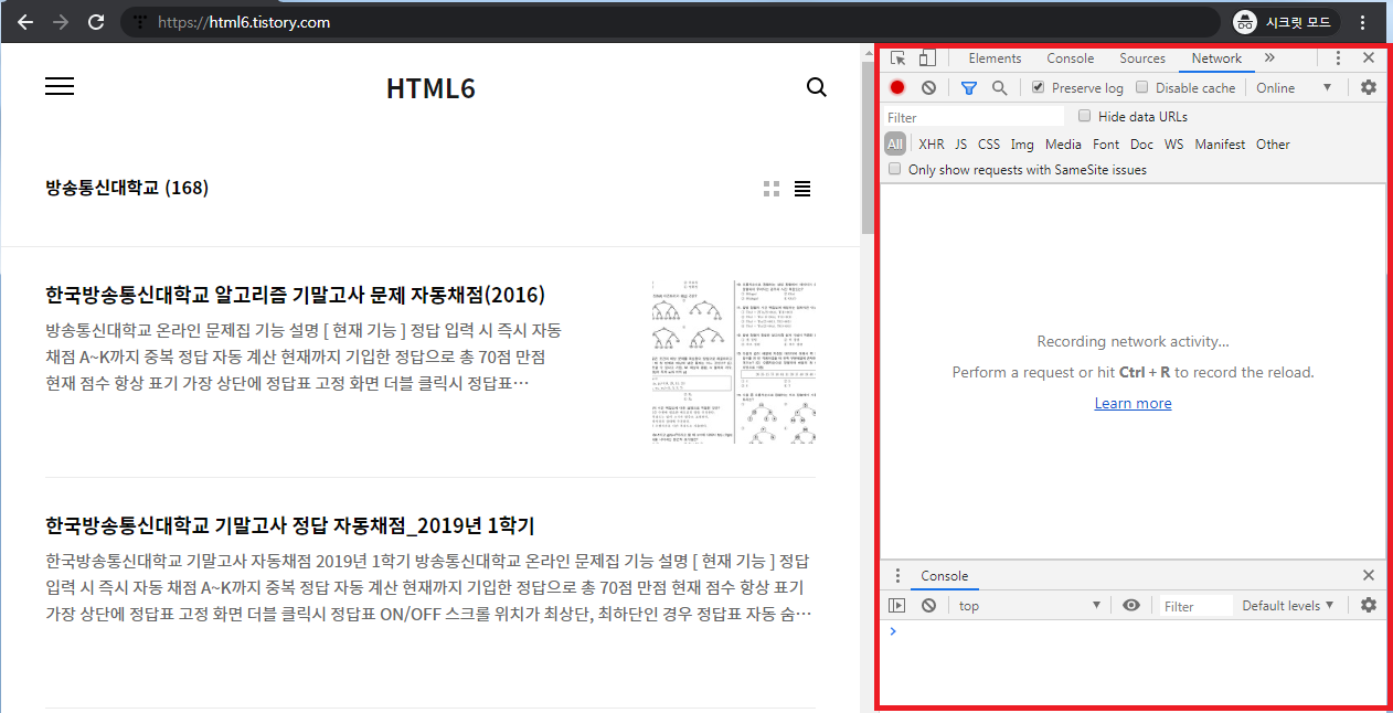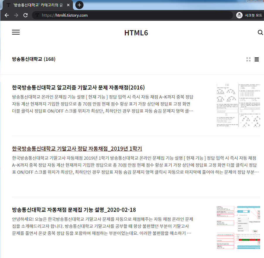 예를 들어 저 같은 경우 제 블로그 주소 ( https://html6.tistory.com/) 를 접속하였습니다.