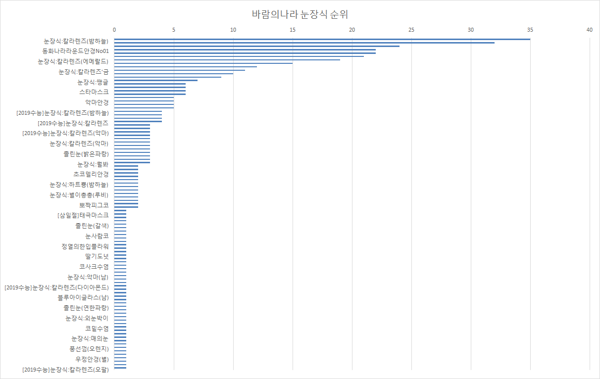 결론적으로 보면 가장 인기가 많은 눈장식은 "눈장식:칼라렌즈(밤하늘)" 인것으로 보입니다.