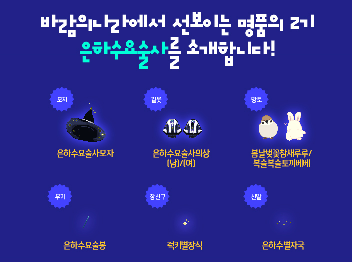 바람의나라 명품의 2기 은하수요술사 부위별 착용 샷 및 전체 착용샷 등을