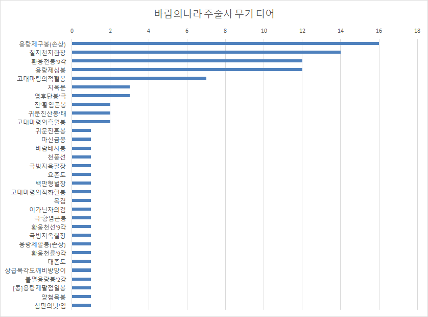 2019/10/11 - [바람의나라] - 바람의나라 무기 통계표 ( 주술사/연 서버/1~100위/2019-10-11 )