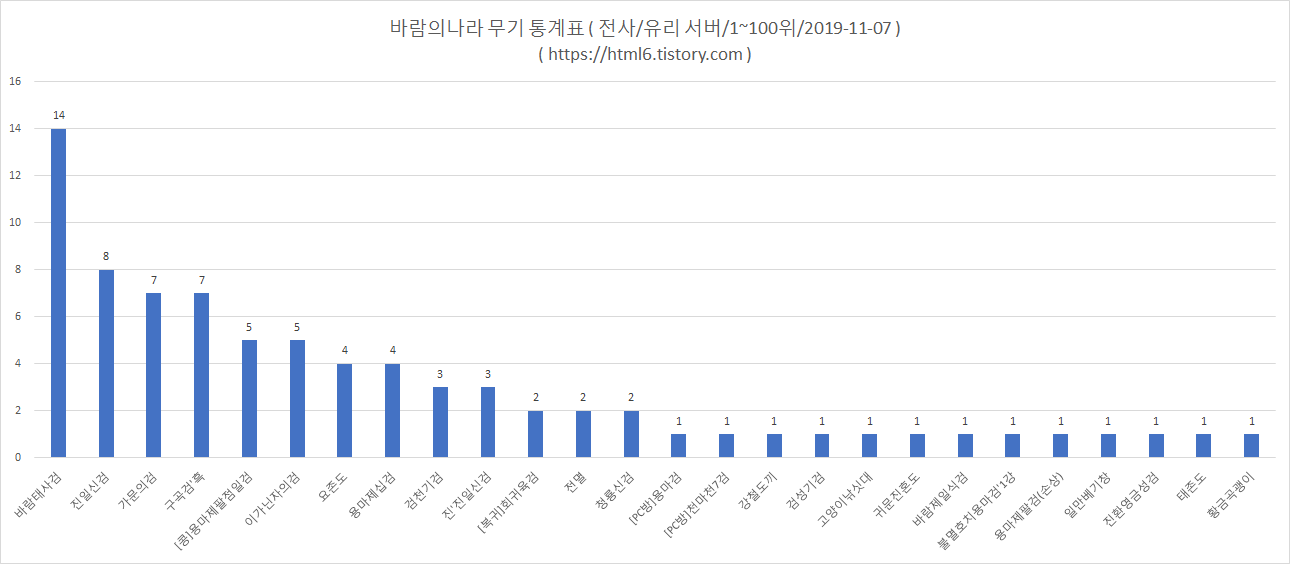 오늘은 바람의나라 게임의 상위 1위부터 100위까지의 무기 통계를 조사하는 시간을 가져보겠습니다.