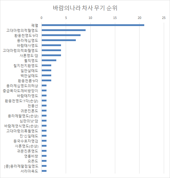 오늘은 바람의나라 게임의 상위 1위부터 100위까지의 무기 통계를 조사하는 시간을 가져보겠습니다.