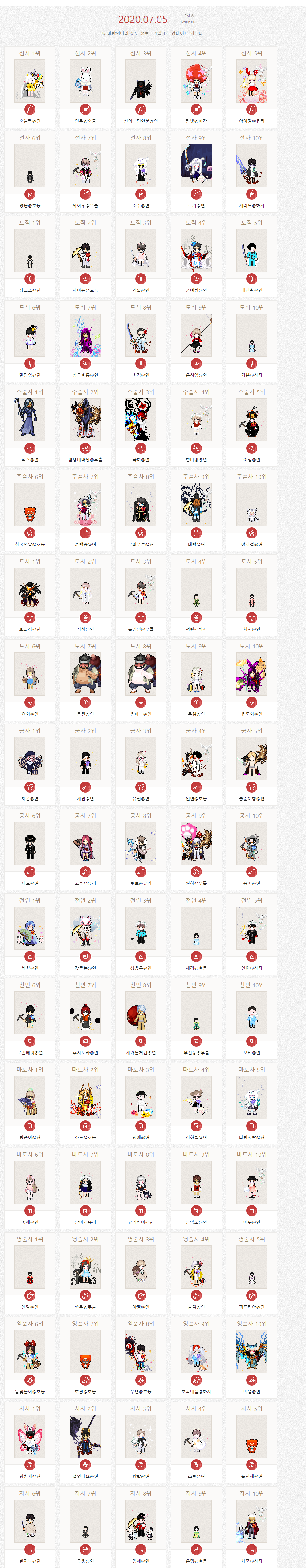 바람의나라 직업별 랭킹 순위_2020-06-11