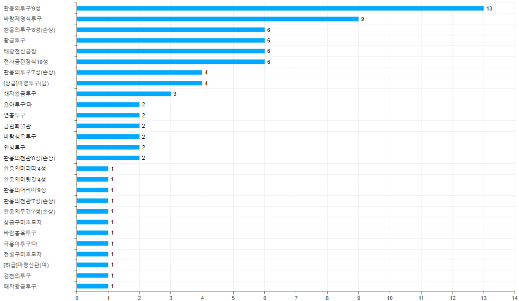 황금투구, 전사금관장식10성 등 가성비 투구도 보이지만 대부분 환웅투구7성 이상에 고급 투구의 점유율이 높아보입니다.