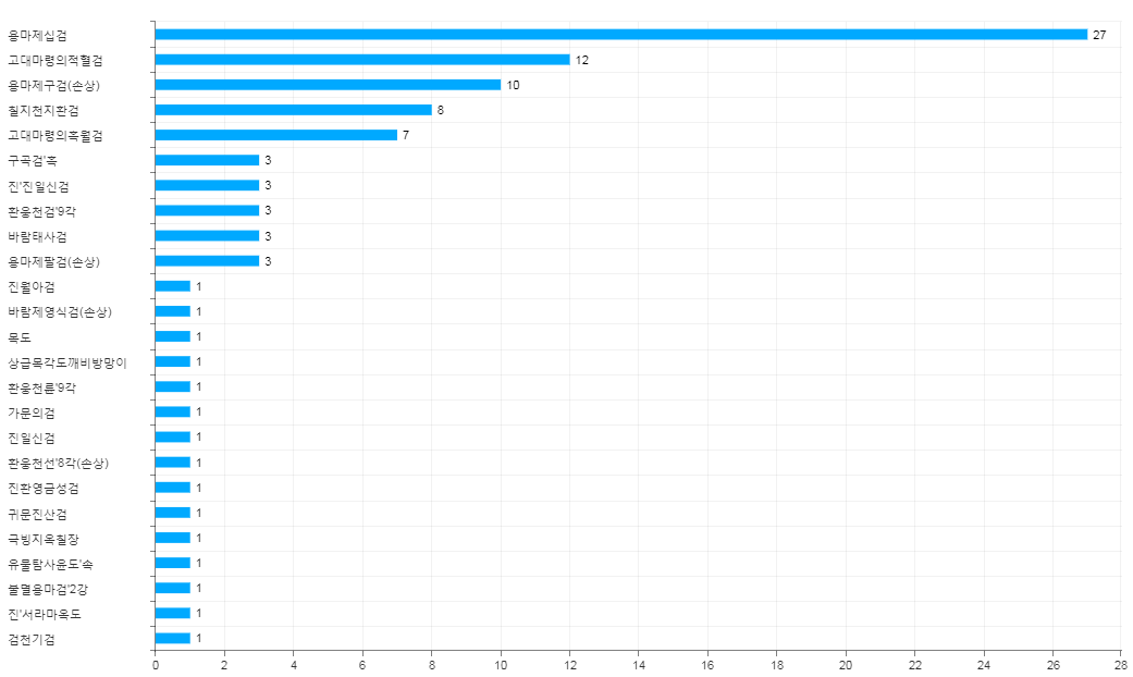 3. 무기 스위칭하여 사용하는 경우 ( 용천제십검을 1개의 캐릭터가 3개씩 들고 다니더라도 집계는 1개만 됩니다. )