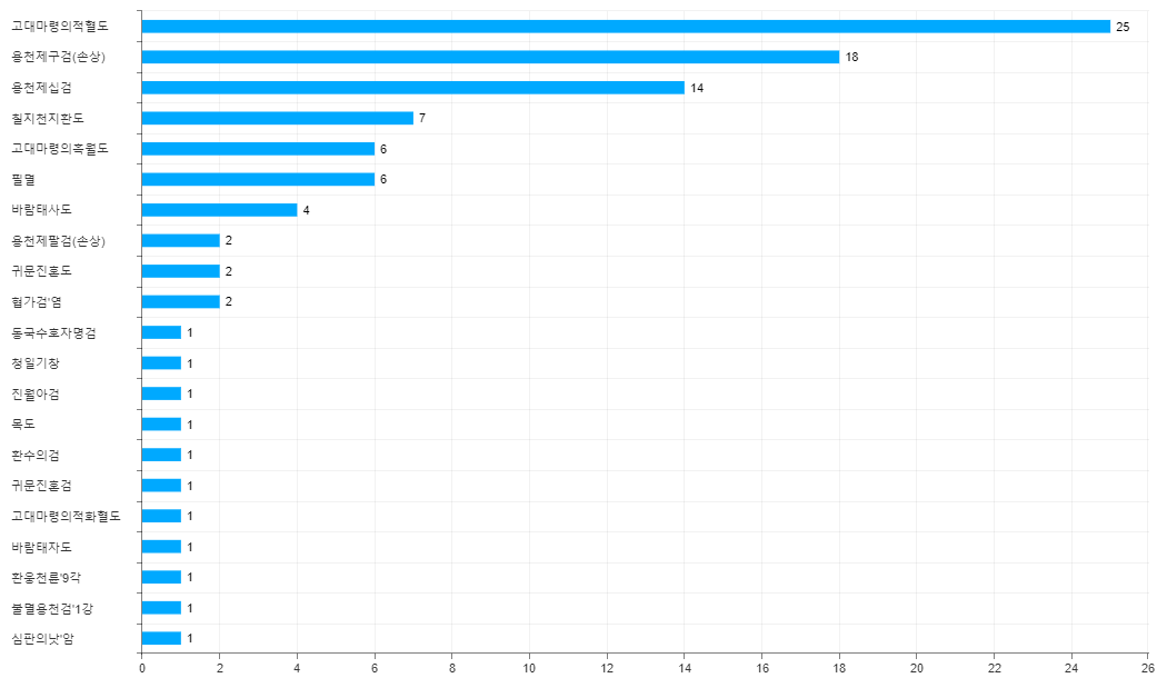 3. 무기 스위칭하여 사용하는 경우 ( 용천제십검을 1개의 캐릭터가 3개씩 들고 다니더라도 집계는 1개만 됩니다. )