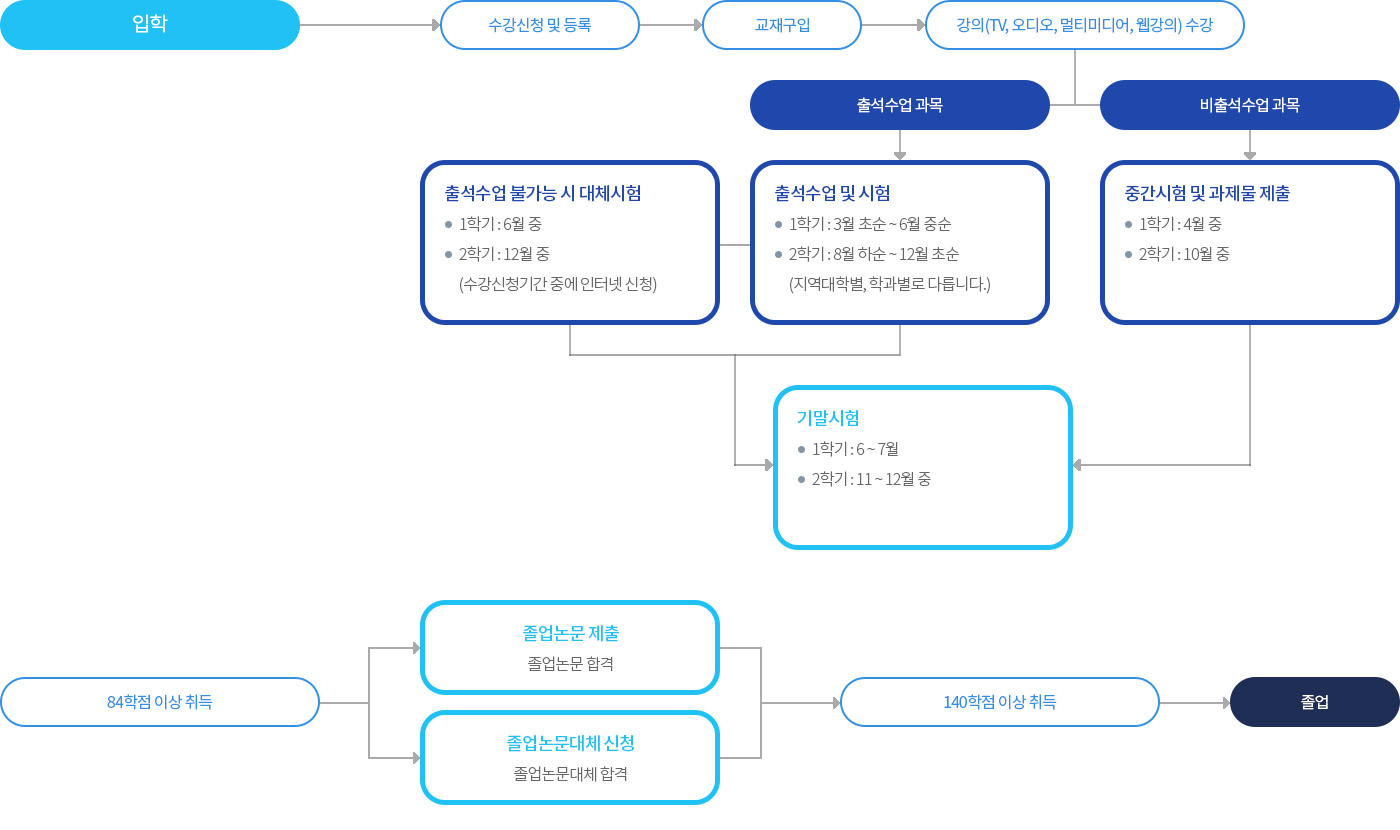 방송통신대학교는 기본적으로 아래와 같은 방식으로 입학하여 졸업까지 재학하게 되어 있습니다.