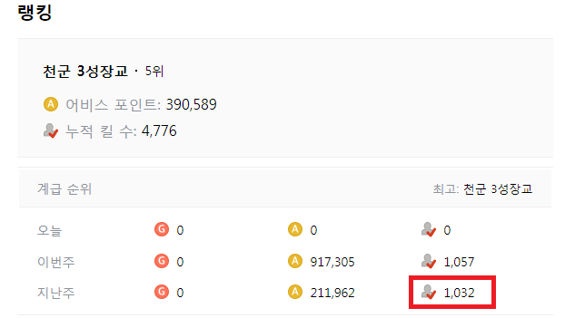 3. 주간 킬 수 가 가장 높은 순서대로 집계하여 순위 랭킹 집계