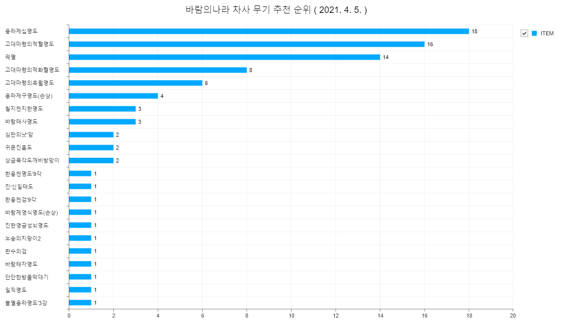 4. 집계 기준은 2021. 4. 5. 집계 당시 바람의나라 게임 안에서 현재 착용 중인 무기