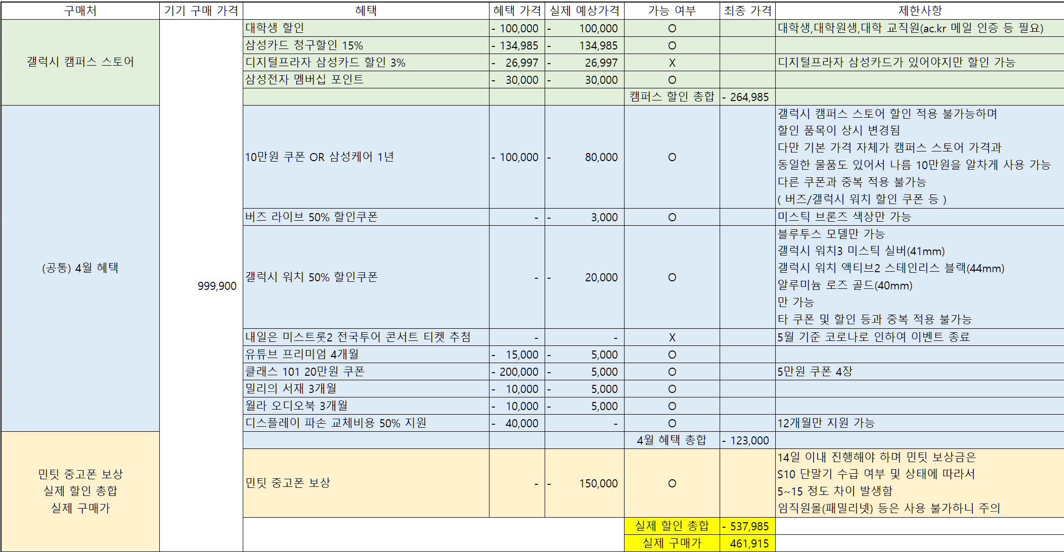 다만 이 방법은 성지가 나올 때까지 기다려야 하고, 정책의 변동이 매우 심하기 때문에 언제 S21을 싸게 구매할 수 있을지 예측하기 어렵고, 관련된 공부를 나름 열심히 해야 합니다. 아주 복잡하죠.