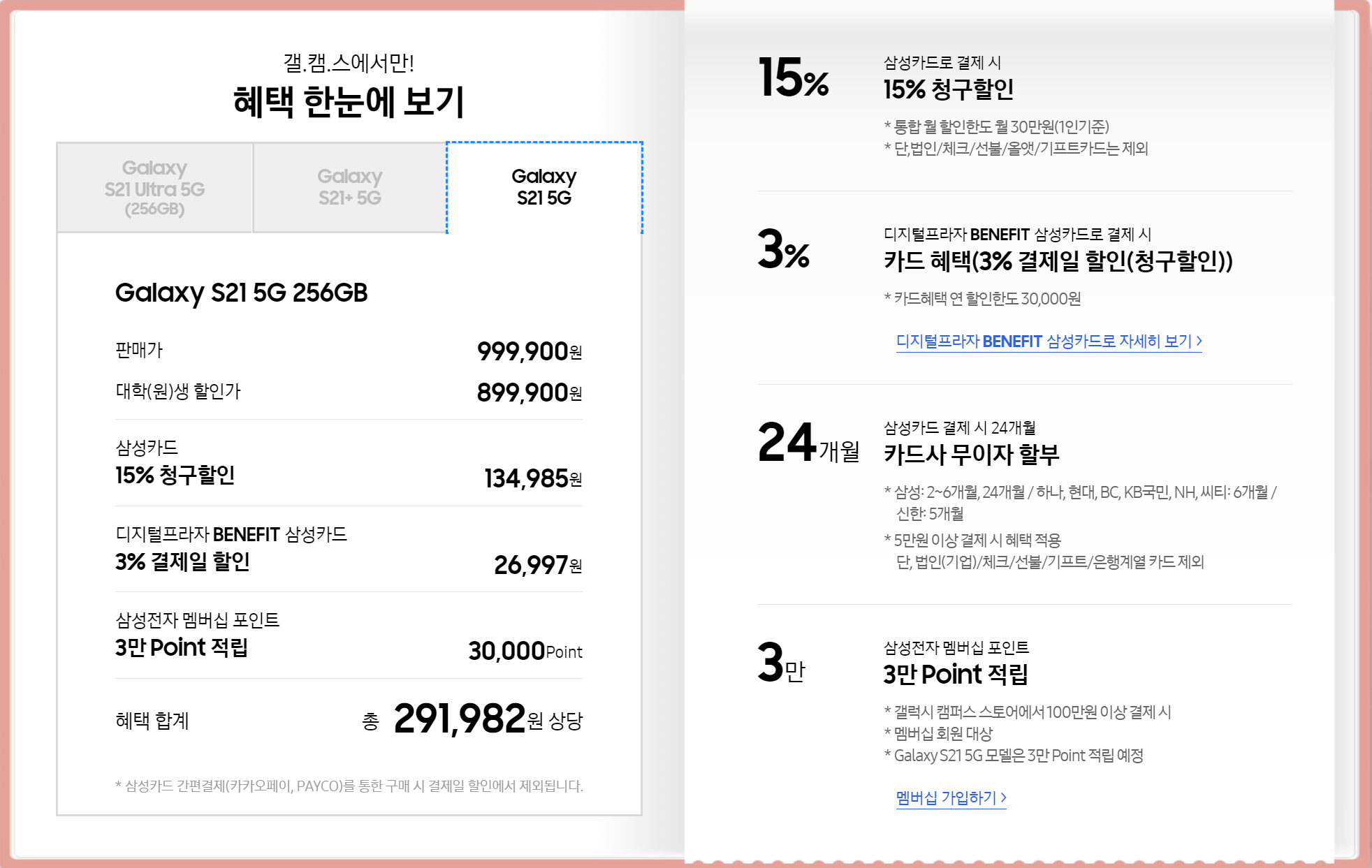 현재 갤캠스에서 S21 구매 시 총 291982원 상당 할인받아 구매가 가능합니다.