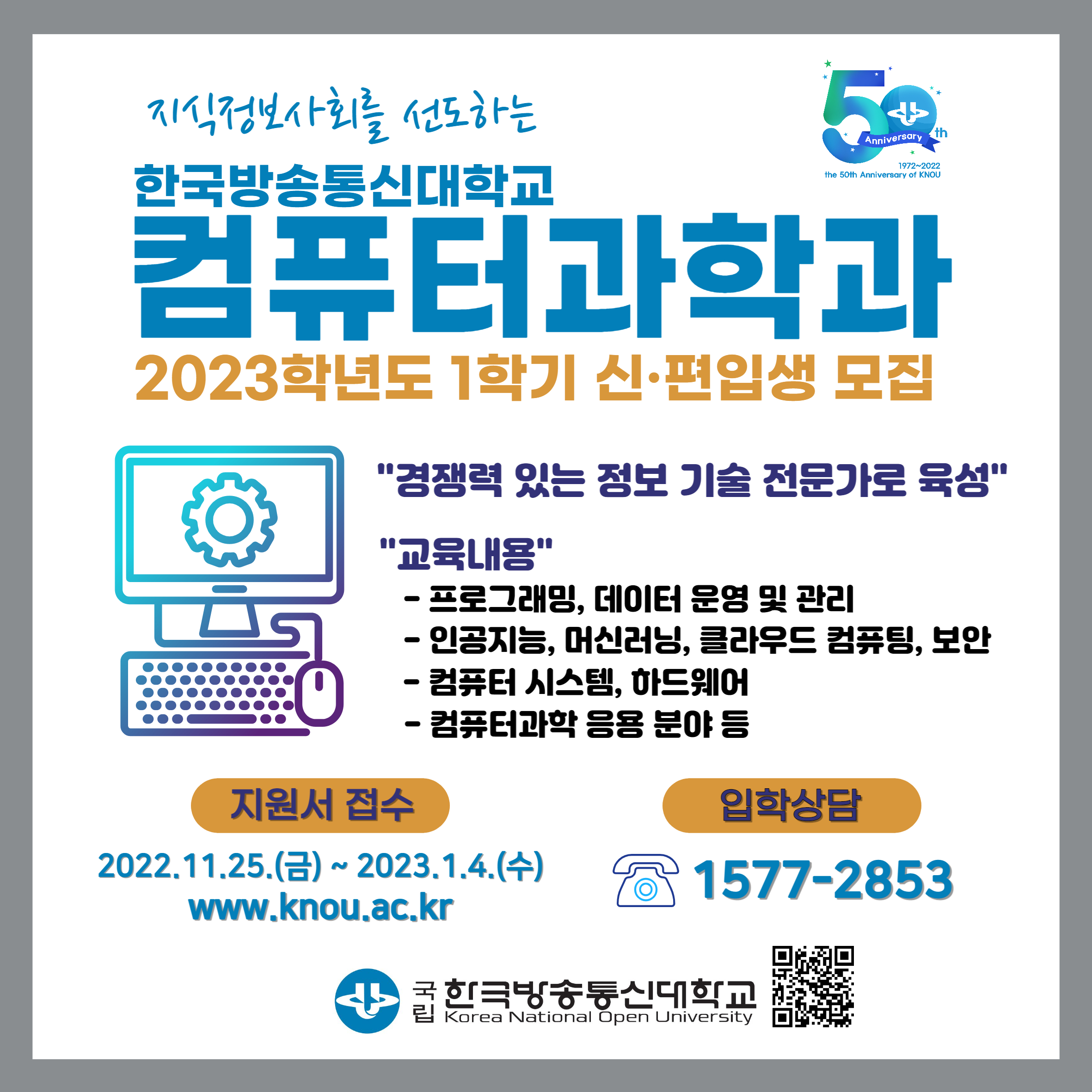 방송통신대학교 컴퓨터학과는 2022년 11월 25일(금)부터 2023년 1월 4일(수)까지 지원서 접수가 가능하며