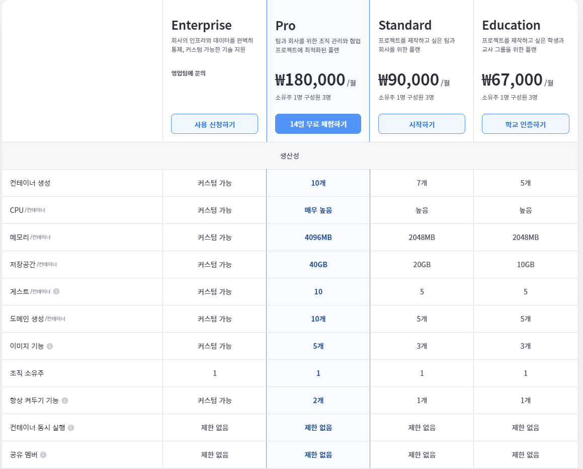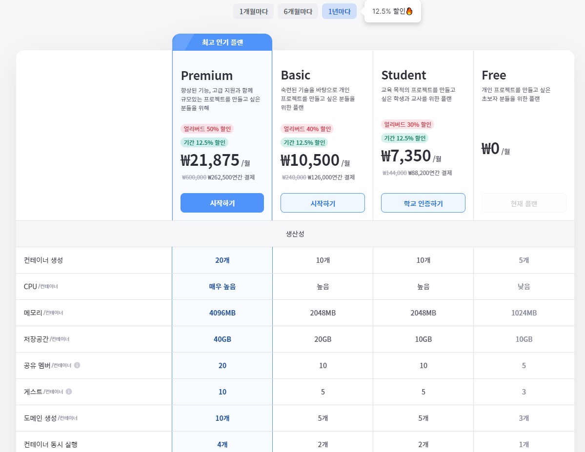 심지어 구름IDE 의 요금제는 IDE뿐만 아니라 각종 기능도 제공하는데, 가격 자체만 보더라도 타사 비슷한 서비스들과 비교해도 오히려 저렴하면 저렴하지 절대 비싸지 않습니다.