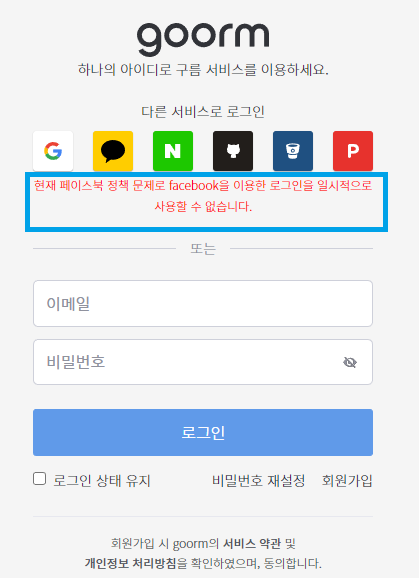 혹은 아래 사진처럼 소셜 로그인 제공 업체에 문제가 생겨서 서비스를 사용할 수 없는 등 로컬 IDE 환경일 때는 생기지 않는 문제가 생길 수는 있습니다.