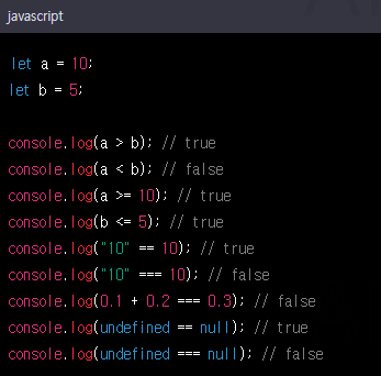위 예제에서는 a와 b의 대소를 비교하는 예제와 문자열과 숫자형의 비교, undefined와 null의 비교 등을 다루고 있습니다.
