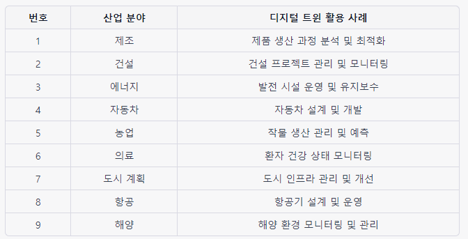 디지털 트윈은 다양한 산업에서 활용될 수 있습니다. 그 중에서도 제조업, 건설업, 운송업 등에서 많이 사용됩니다.