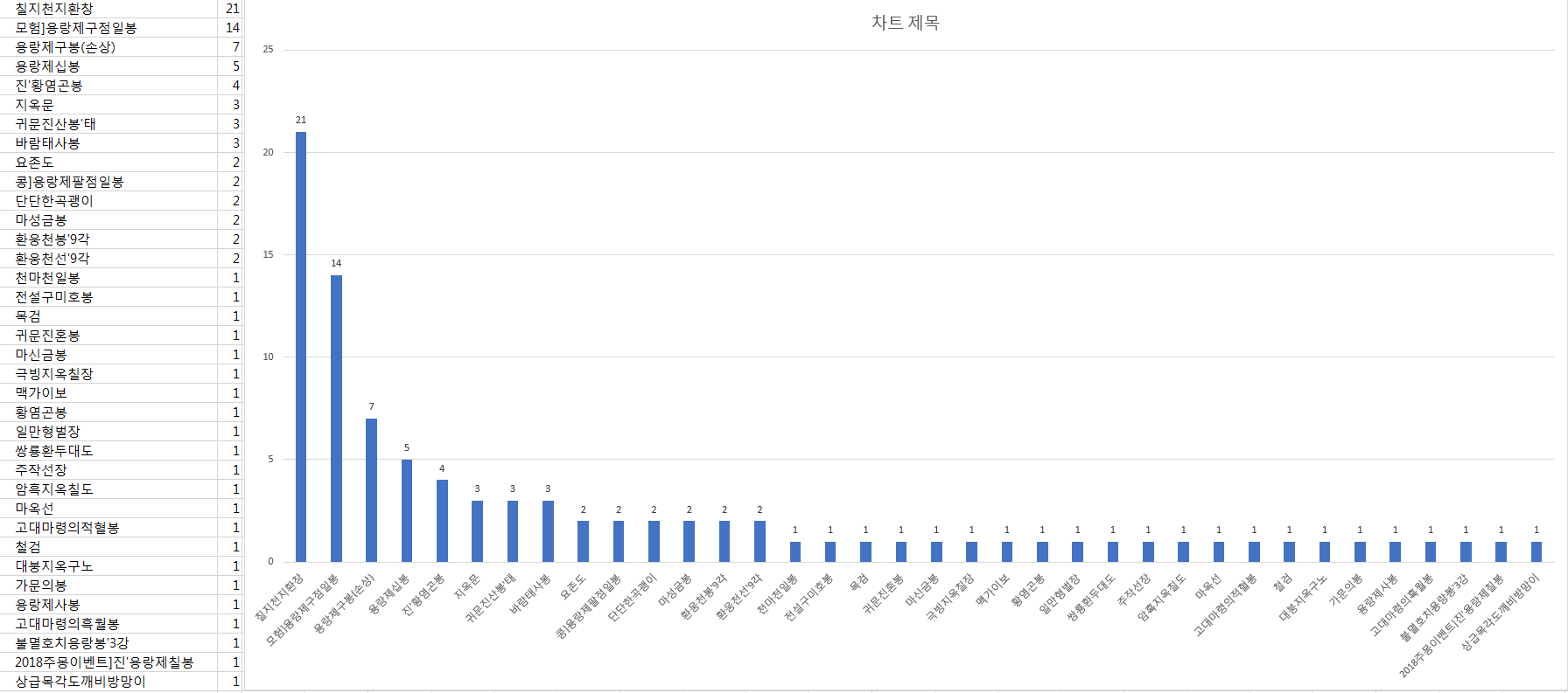 결론적으로 보면 가장 인기가 많고 강력한 무기는 모험]용랑제구점일봉, 용랑제구봉(손상), 용랑제십봉 으로 보입니다.
