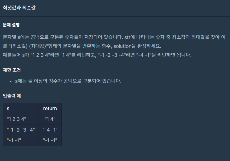 위의 코드는 주어진 문자열 s에서 공백으로 구분된 숫자들을 추출하여, 최소값과 최대값을 찾아서 "(최소값) (최대값)" 형태의 문자열로 반환하는 함수입니다.