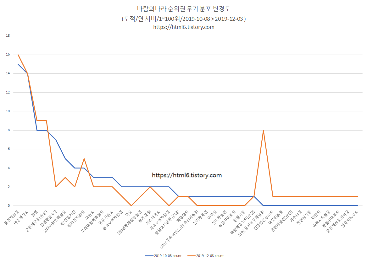 바람의나라 순위권 무기 분포 변경도 (도적/연 서버/1~100위/2019-10-08 > 2019-12-03 )